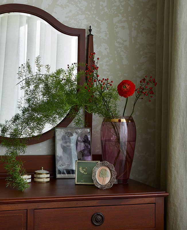 Спальня. Тумба и зеркало хозяева привезли из прежней квартиры. Обои Schumacher. Гербарии — работа Юлии Голавской.