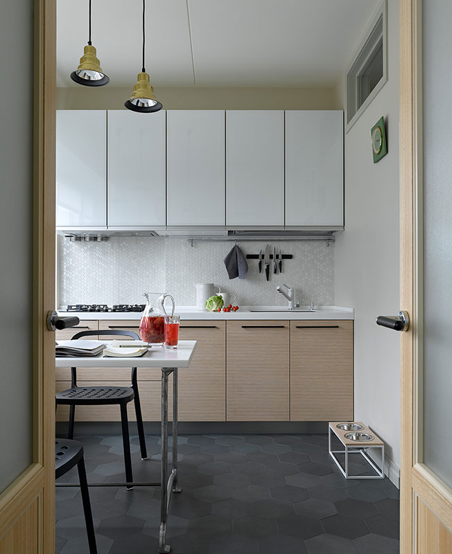 Интригующее название «На стыке», которое Юлия Голавская дала своему проекту, объясняется просто: квартира площадью 70 кв. м находится в том месте, где cтыкуются два корпуса дома. Они расположены под углом друг к другу, отчего квартира приобретает сложную асимметричную форму. Другое объяснение: в интерьере естественным образом соединяются старое и новое, современные предметы и винтаж.