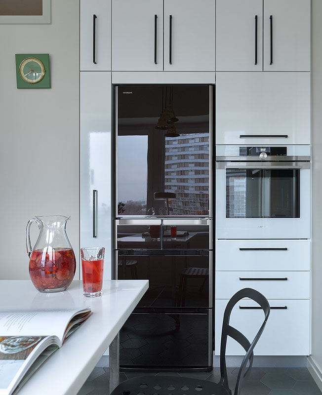 Фасады кухни отделаны белым лаком. Холодильник Hitachi.