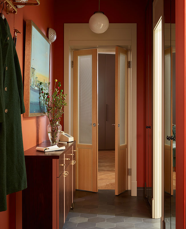 В квартире два основных оттенка, два легких светло-серых тона. В них выкрашены стены и потолки в гостиной, столовой, кухне. Примерно того же цвета и обои в спальне: «пиксельный» лес американского бренда Schumacher. Исключение — прихожая: ей придали теплый кирпично-красный цвет. «Хотелось, чтобы вход был выразительным. К тому же в прихожую не проникает естественный свет — если такую сделать белой, она станет блеклой и невыразительной. А тут заходишь — и тебя сразу обволакивает теплом. Мы использовали краску Benjamin Moore. Качество отличное».