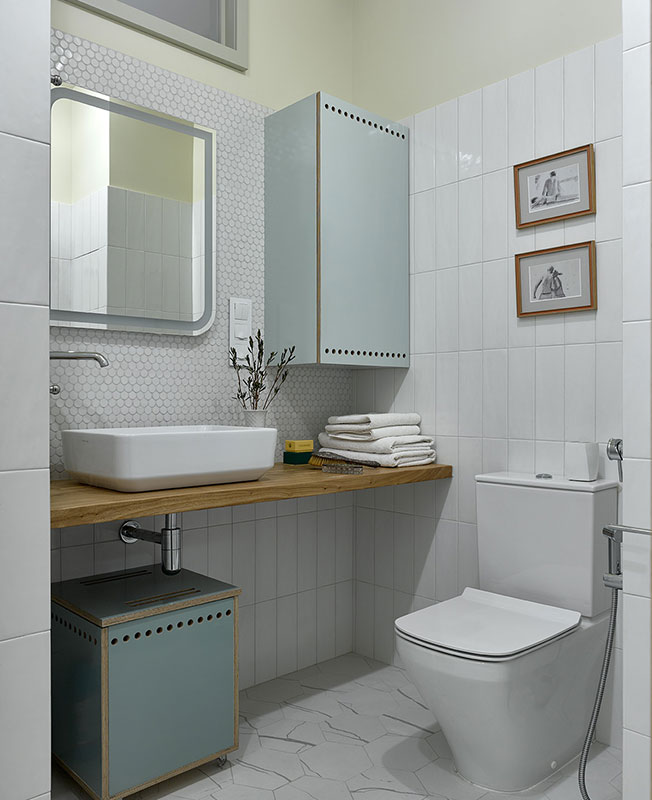 Шкафчики в голубой отделке выполнены на заказ. Сантехническое оборудование: Roca.