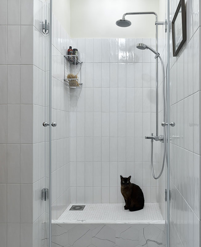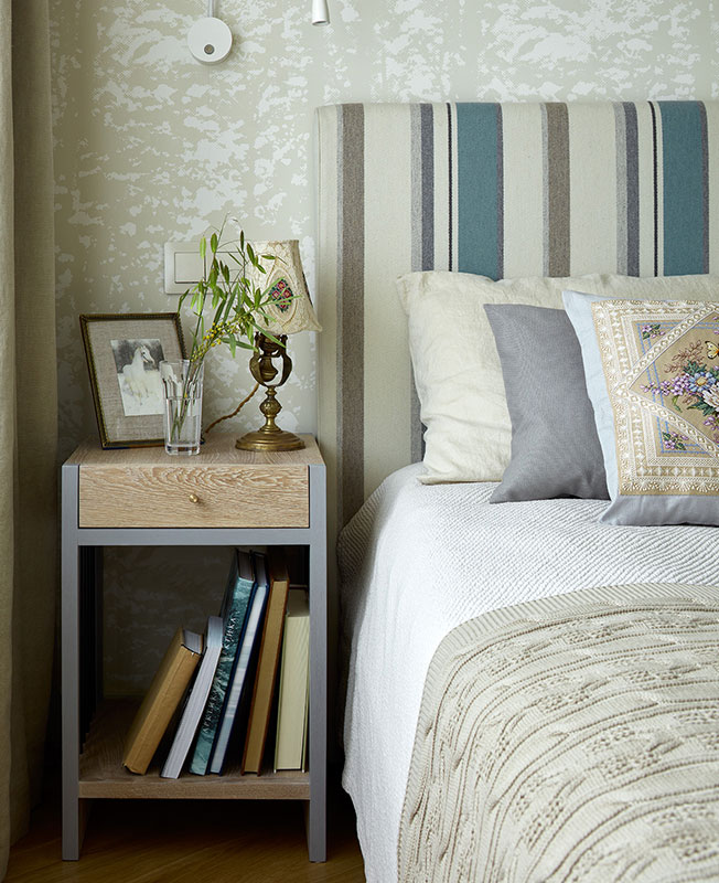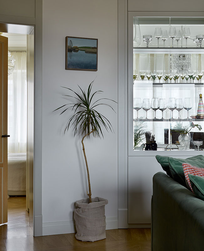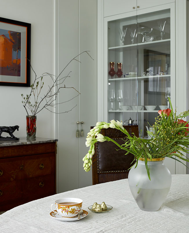 Встроенный шкаф от пола до потолка не только служит для хранения вещей. Он задуман как ритмическая проработка стены, к тому же скрывает перепад уровней потолка. «Хотелось дать большой объем одного цвета», — говорит Юлия Голавская. Квартира расположена в доме, построенном в 1973 году по индивидуальному проекту. Автор, Юлия Голавская, вдохновлялась временем постройки и стилем жизни заказчиков. Интригующее название «На стыке», которое Юлия Голавская дала своему проекту, объясняется просто: квартира площадью 70 кв. м находится в том месте, где cтыкуются два корпуса дома. Они расположены под углом друг к другу, отчего квартира приобретает сложную асимметричную форму. Другое объяснение: в интерьере естественным образом соединяются старое и новое, современные предметы и винтаж. Так как гостиная и столовая соединяются линейкой прозрачных шкафов-витрин, делать контрастными их не хотелось. Комнаты выдержаны в единой светлой палитре. «Обычно я предпочитаю работать с понятными планами, прямоугольными и квадратными комнатами приятных пропорций, — говорит Юлия Голавская. — В данном случае изначальная планировка cимпатий не вызывала. Тем более что на стыке был еще и значительный перепад высоты потолка. Возможно, раньше я не стала бы заниматься такой квартирой, а тут наоборот — стало интересно. Заинтриговала длинная скошенная стена, понравились окна во всю ширину стены в каждой комнате — практически ленточное остекление. Из окон открываются великолепные виды на город, парк, Воробьевы горы — дом находится в районе Ленинского проспекта». Вид из кухни в столовую. Скамью с высокой спинкой в голубой обивке спроектировала Юлия Голавская. Реализация: мастерская Vysotka Home. Под сиденьем предусмотрен объем для хранения вещей. На стене работа Ольги Леонтьевой «Тучи». К витрине примыкает встроенный шкаф. Он находится там, где раньше была дверь из коридора в столовую. После перепланировки коридор отдали ванной комнате. Фрагмент гостиной. На стене пейзаж работы Саши Пастернак. Cлева вход в спальню. Диван изготовлен на заказ. Винтажный столик куплен на аукционе. Заказчики — семейная пара. Взрослая дочь поселилась отдельно, родители живут своей насыщенной жизнью. Муж увлекается аристократическим видом спорта — конным поло. Ездит на турниры в Англию. Хозяева любят путешествовать, часто берут с собой питомцев — у них есть два красивых породистых кота и собака, баварская гончая. «Это уже второй случай в моей практике, когда я работаю для людей, страстно любящих лошадей и собак. Возможно, это просто совпадение, но и в том и другом случае заказчики — просто чудо». ТВ-тумба и двери разработаны Юлией Голавской. «Триптих» над телевизором — фото из семейного архива. На них изображены лошади: хозяин дома увлекается конным поло. Слева винтажное кресло, переобитое в шерсть марки Kirkby. Люстра: винтаж. Новые хозяева хотели изменить планировку. «Нам позволили снести перегородку между столовой и гостиной (теперь две комнаты разделены красивыми шкафами-витринами). Разрешили задействовать под санузел коридор, который вел из прихожей в кухню. Также удалось прорубить проем в несущей стене, позволяющий попадать в кухню из столовой. Обычно я не вторгаюсь в конструктив здания, но здесь этого хотели заказчики. Они сами провели исследование и выяснили, что в данном доме такие 