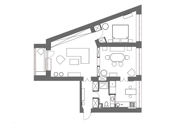«Обычно я предпочитаю работать с понятными планами, прямоугольными и квадратными комнатами приятных пропорций, — говорит Юлия Голавская. — В данном случае изначальная планировка cимпатий не вызывала. Тем более что на стыке был еще и значительный перепад высоты потолка. Возможно, раньше я не стала бы заниматься такой квартирой, а тут наоборот — стало интересно. Заинтриговала длинная скошенная стена, понравились окна во всю ширину стены в каждой комнате — практически ленточное остекление. Из окон открываются великолепные виды на город, парк, Воробьевы горы — дом находится в районе Ленинского проспекта».