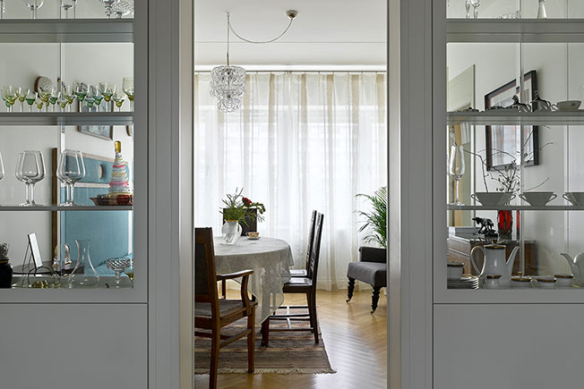 Новые хозяева хотели изменить планировку. «Нам позволили снести перегородку между столовой и гостиной (теперь две комнаты разделены красивыми шкафами-витринами). Разрешили задействовать под санузел коридор, который вел из прихожей в кухню. Также удалось прорубить проем в несущей стене, позволяющий попадать в кухню из столовой. Обычно я не вторгаюсь в конструктив здания, но здесь этого хотели заказчики. Они сами провели исследование и выяснили, что в данном доме такие преобразования возможны. Мы их успешно согласовали».