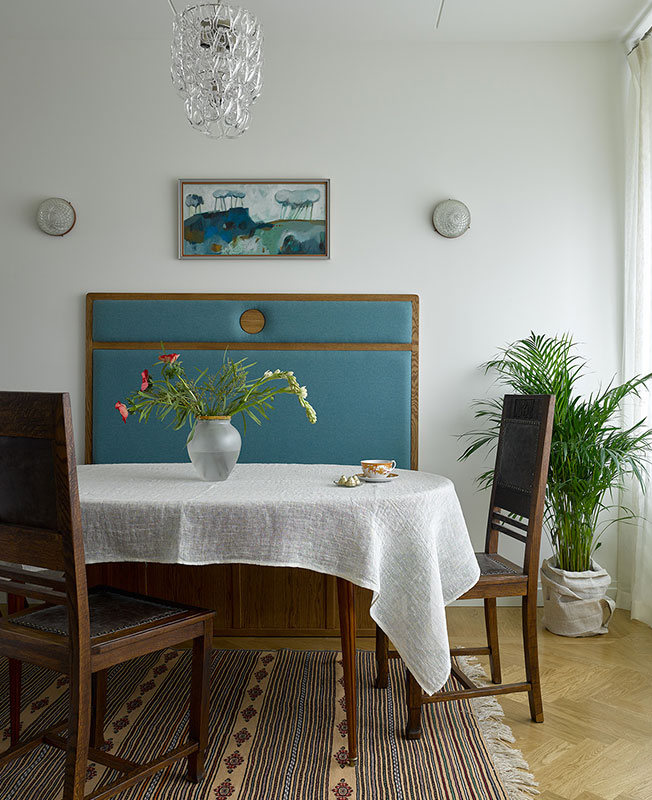 Вид из кухни в столовую. Скамью с высокой спинкой в голубой обивке спроектировала Юлия Голавская. Реализация: мастерская Vysotka Home. Под сиденьем предусмотрен объем для хранения вещей. На стене работа Ольги Леонтьевой «Тучи».