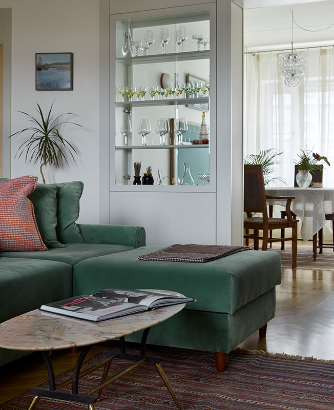 Квартира расположена в доме, построенном в 1973 году по индивидуальному проекту. Автор, Юлия Голавская, вдохновлялась временем постройки и стилем жизни заказчиков.