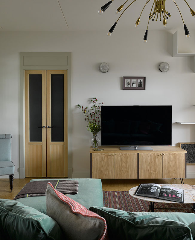 ТВ-тумба и двери разработаны Юлией Голавской. «Триптих» над телевизором — фото из семейного архива. На них изображены лошади: хозяин дома увлекается конным поло. Слева винтажное кресло, переобитое в шерсть марки Kirkby. Люстра: винтаж.