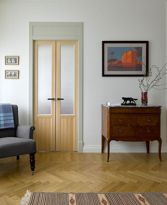 Дизайнер разработала стильные двери в шпоне сейбы. Благодаря высоким наличникам они кажутся выше. Столярные изделия: мастерская DoorsPro. Винтажный комод получил новую мраморную столешницу. На стене работа Алексея Ланцева.