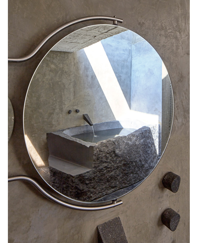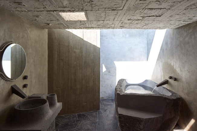 В ванной комнате каменные раковины и свет, льющийся сверху.