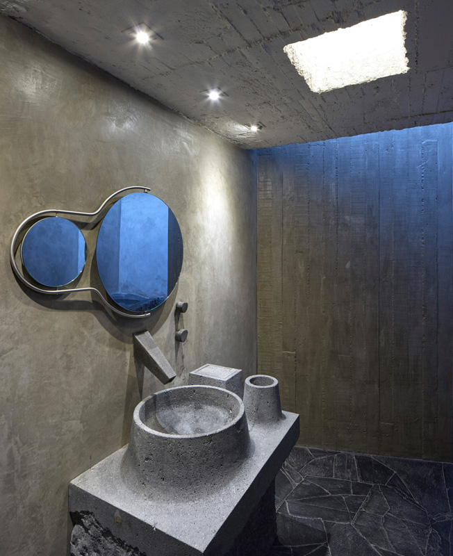 Наверху расположены хозяйская спальня, две детские комнаты и семейная ванная комната. Ванна высечена из камня. Педро Рейес хотел, чтобы она напоминала скальный бассейн. Свет в ванной комнате льется сверху. Форма раковина трактована как перевернутый керамический сосуд. Брутальный бетон виллы оттенен зеленью. Посреди дома устроен атриум с тропическими растениями, а том числе с редкими кактусами.