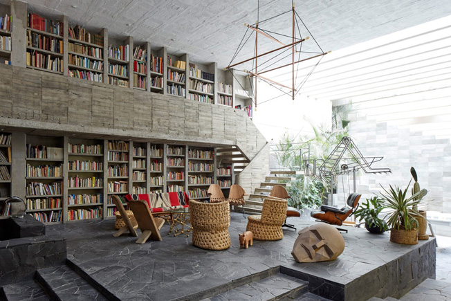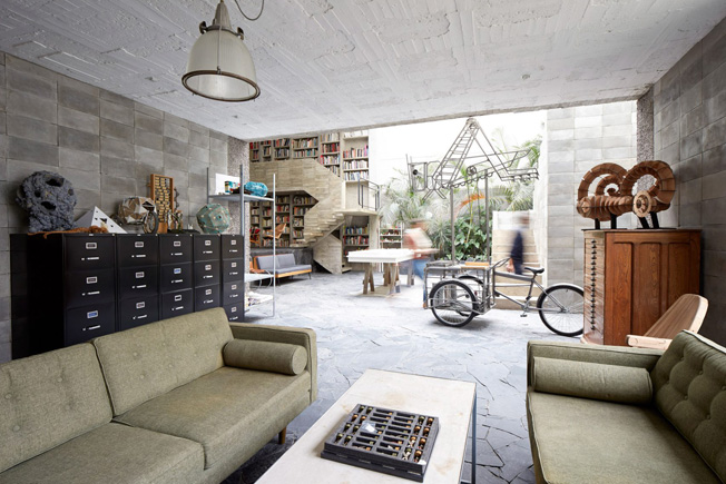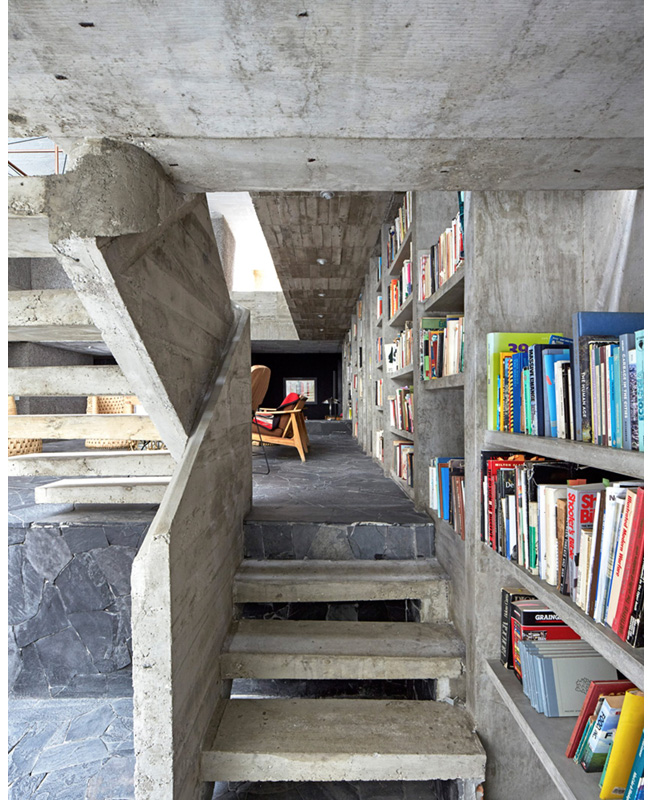 Дом и студия Педро Рейеса и его жены Карлы Фернандес — настоящая бетонная вилла, с красивыми брутальными стенами, эффектной лестницей и двухуровневой библиотекой.