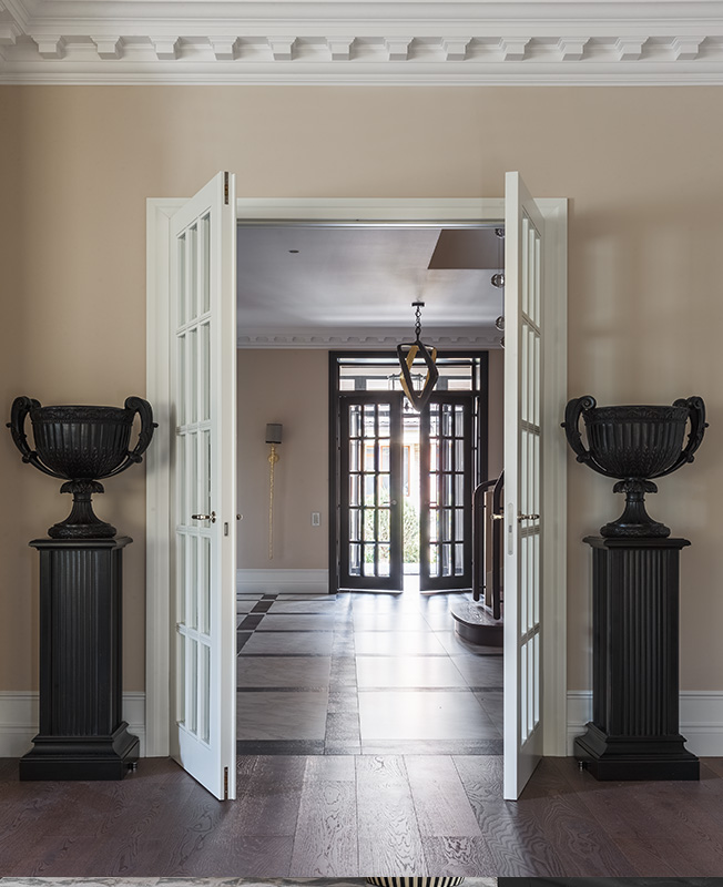 Симметричная композиция в сочетании с распашными дверями придает холлу торжественный, парадный вид. Вазы на постаментах Chelini. Люстра Porta Romana.