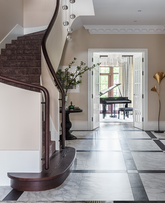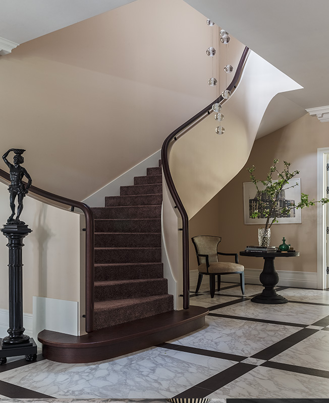 Парадные помещения первого этажа образуют анфиладу. В глубине видна гостиная. Лестница останавливает взгляд томными изгибами. Столик Crate and Barrel, торшер Creativ Light. Люстра Bocci.