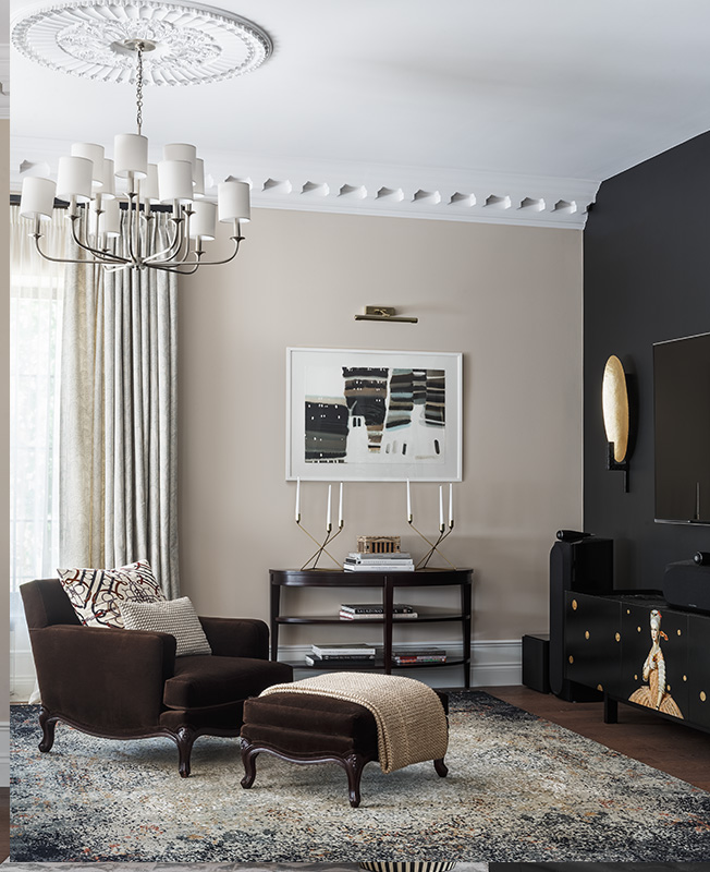 Гостиная. ТВ-зона. Кресло Ralph Lauren Home. Отделанный лаком комод выполнен по эскизам архитекторов и расписан Брониславом Карандаевым. Люстра Arteriors. На стене акварель Полины Егорушкиной. Ковер Dovlet House.