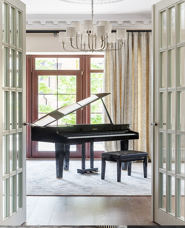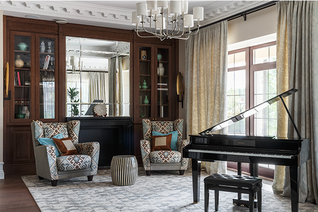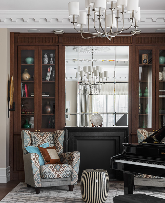 Г-образная гостиная состоит из двух зон. Одна из них — музыкальная, с роялем и камином от компании «Камины Петербурга». Библиотека выполнена по чертежам архитекторов. Столик Creativ Light. Люстра Arteriors.