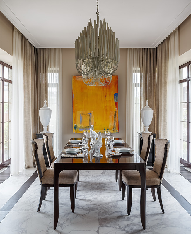 Столовая оформлена в нейтральной гамме, Яркая живописная работа Алексея Ланцева подобна солнцу. Стол и стулья Baker, люстра Arteriors. Постаменты Eichholtz, вазы Global Views.