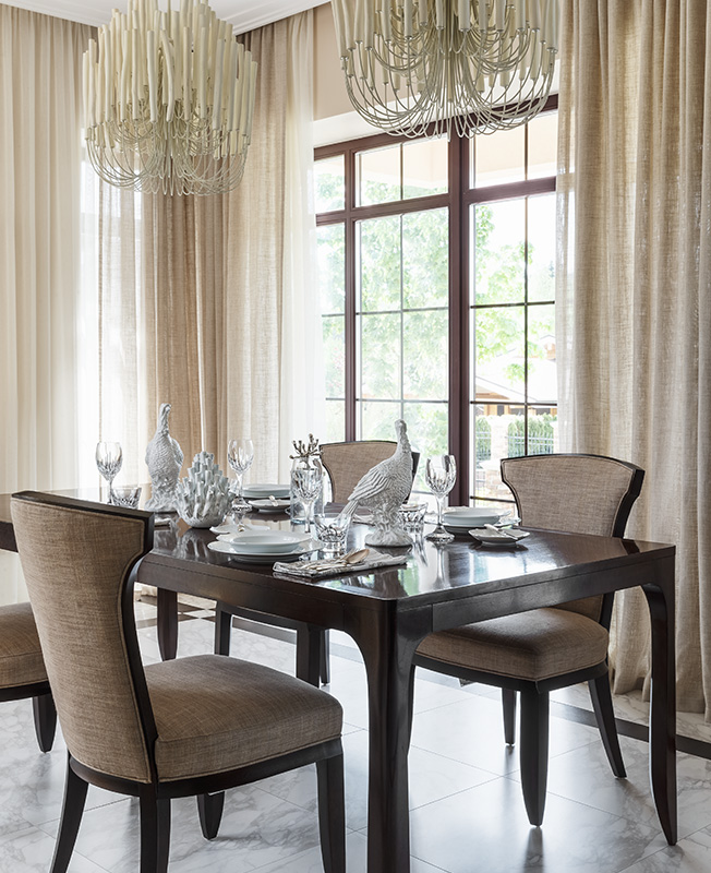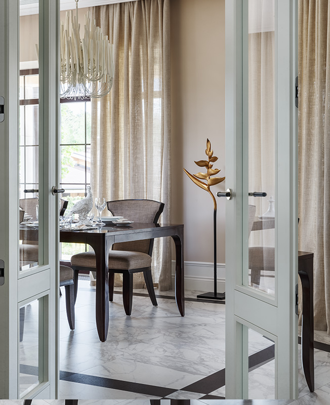 Cтоловая оборудована в присоединенной веранде. C остеклением по трем сторонам, это самая светлая комната в доме. Стол и стулья Baker, люстра Arteriors.
