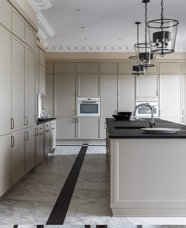 Кухня примыкает к столовой и также оформлена в нейтральной палитре. Столешница и линии пола черного цвета — акценты в монохромном интерьере. Кухня Aster Cucine.