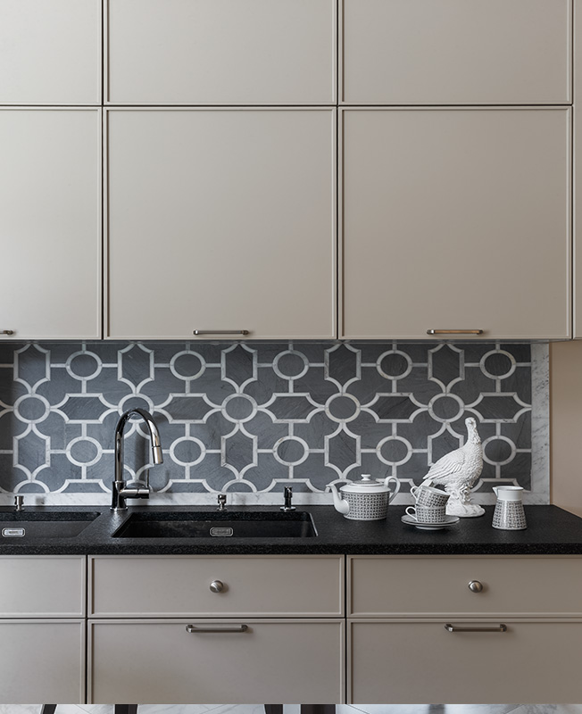 Кухня примыкает к столовой и также оформлена в нейтральной палитре. Кухонный фартук с мозаичным орнаментом от компании New Ravenna — выразительный акцент. Кухня Aster Cucine.