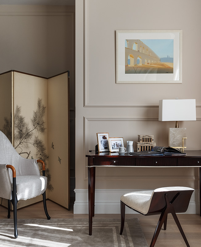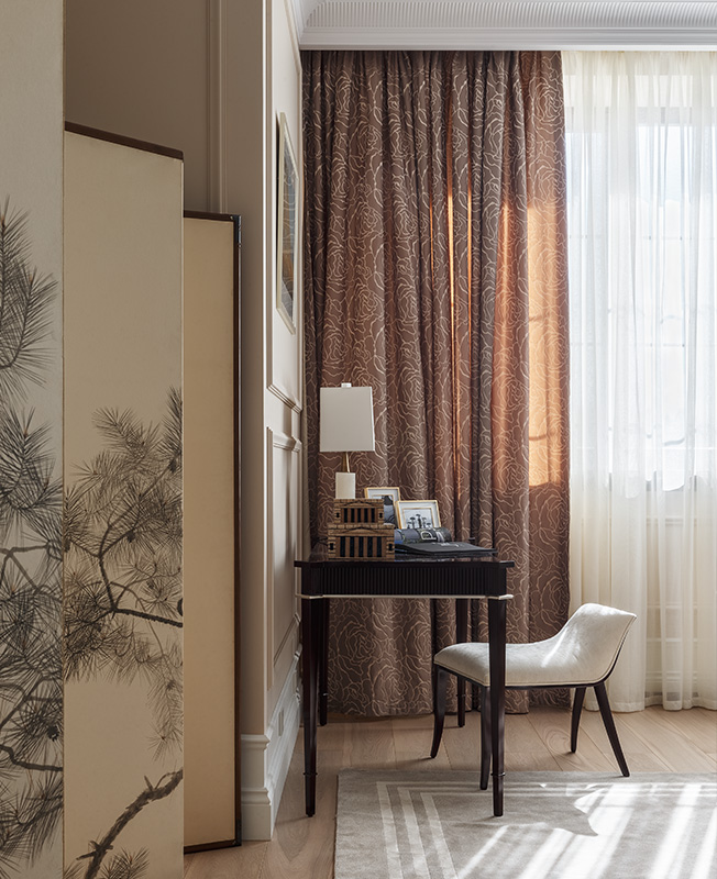 Гостевая спальня. Слева кресло Giorgetti. Туалетный столик и стул с низкой спинкой Gentry Home. Антикварная ширма привезена из Японии.