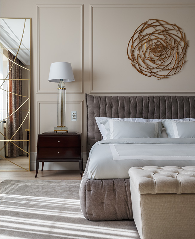 Cпальня хозяев. Прикроватные тумбы Gentry Home. Настольная лампа: антиквариат. Декоративный объект в изголовье Creativ Light вторит линиям зеркала Christopher Guy. Постельное белье Frette.