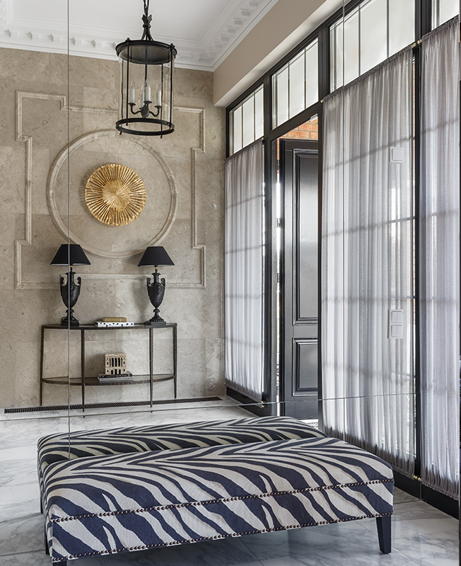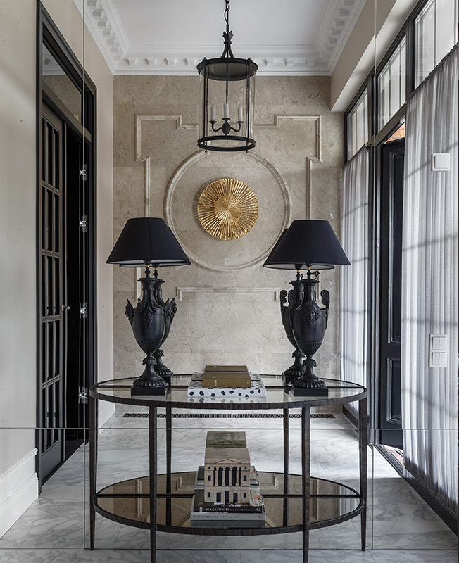 Роскошь начинается с порога: утепленный тамбур выглядит как парадный салон. На стенах отделака из доломита, зеркальное полотно раздвигает границы помещения. Антикварные лампы куплены во Франции. Консоль Crate and Barrel, люстра Robers.