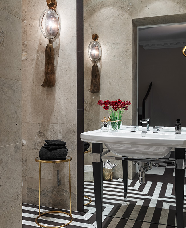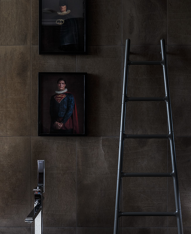 Мужская ванная комната. На темном мраморе — работы Саши Гольдбергера. Фотограф изображает героев комиксов и блокбастеров в стилистике старых фламандских мастеров. Полотенцесушитель-лестница Tubes, смеситель Gessi.
