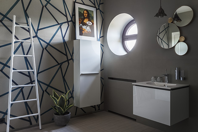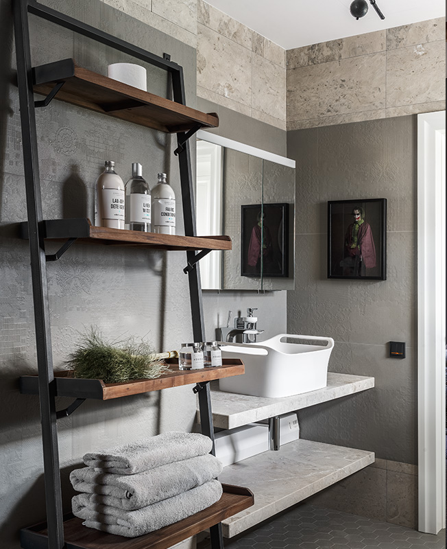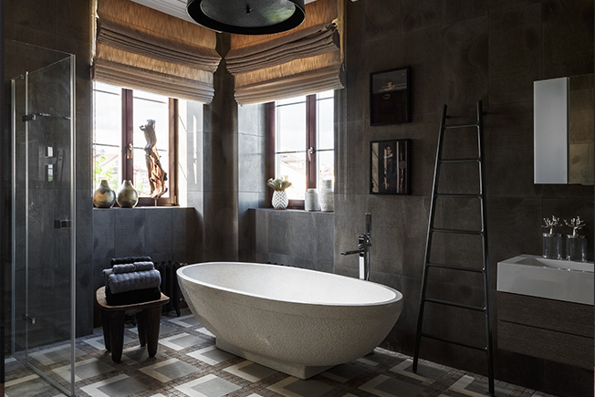 Мужская ванная комната. Ванна Bati, смеситель Gessi, полотенцесушитель в виде лестницы Tubes. На стенах работы фотографа Саши Гольдбергера. Он изображает героев комиксов и блокбастеров в духе старых фламандских мастеров