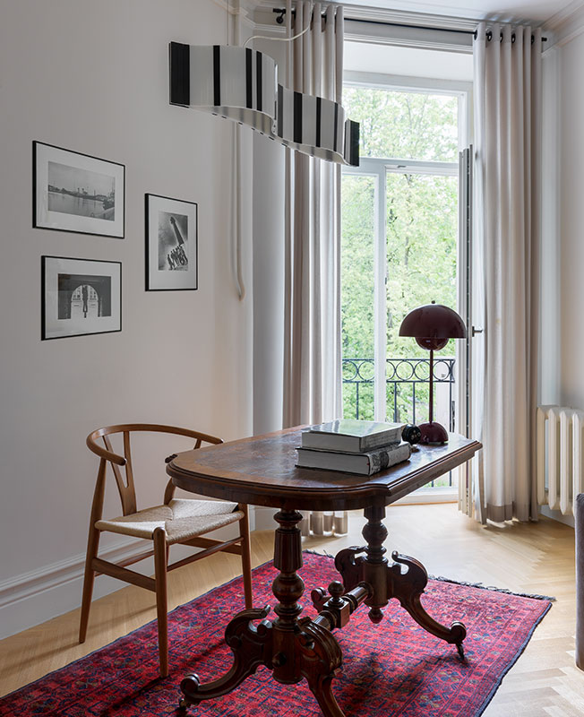 Кабинет. Французское окно в пол появилось во время реконструкции — поскольку комната выходит во двор, изменения фасада удалось согласовать. На антикварном столе лампа &tradition. Люстра Arturo Alvarez. Шелковый ковер: узбекский винтаж.
