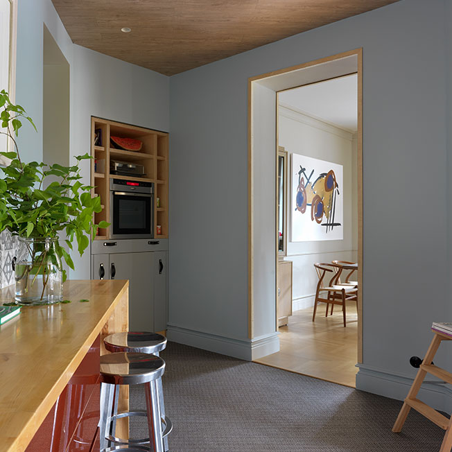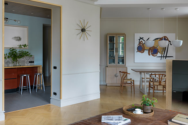 Благодаря тому, что проемы между кухней и гостиной оставлены открытыми, кухня стала частью общего пространства. Часы Vitra. Для стен использована краска Benjamin Moore.