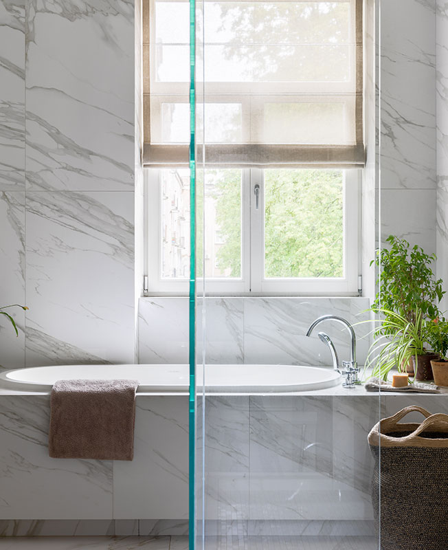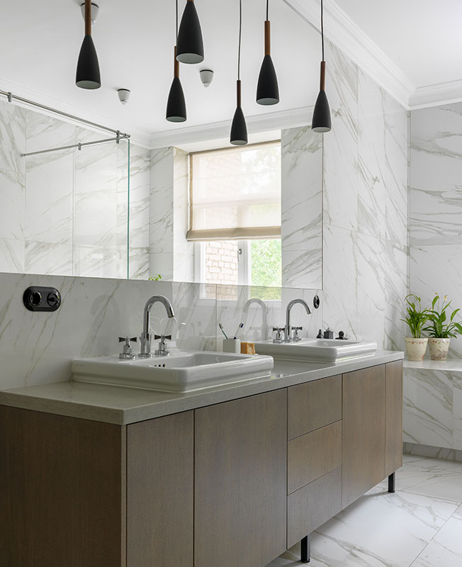 Ванную комнату разместили в бывшей жилой комнате, поэтому в ней есть окно. Стены и пол отделали мрамором. Мужчины-спортсмены часто принимают душ, Ольга предпочитает расслабляющую ванну, так что установили и ванну, и душевую кабину, а также две раковины. Красота неотделима от функции.