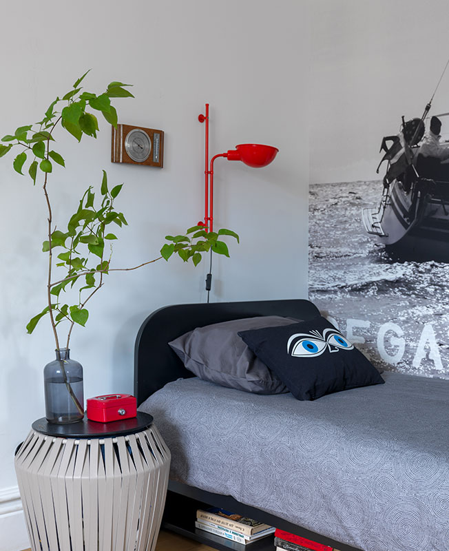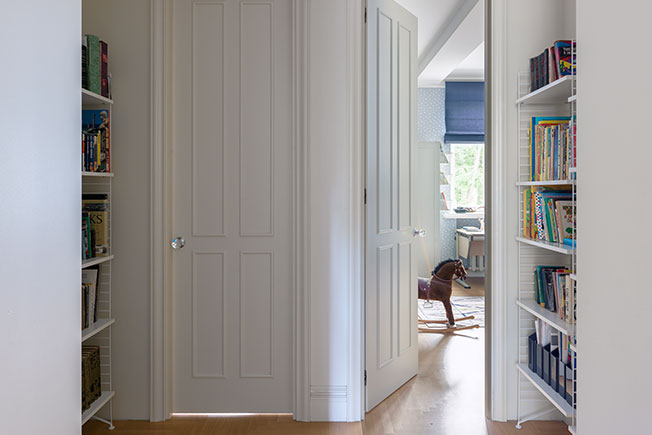 Особая гордость дизайнера — двойная дверь в детскую, со специальным механизмом и скрытыми петлями. В закрытом виде воспринимаются как часть стены. Стеклянные ручки привезены из Таллина. Стеллажи String System.