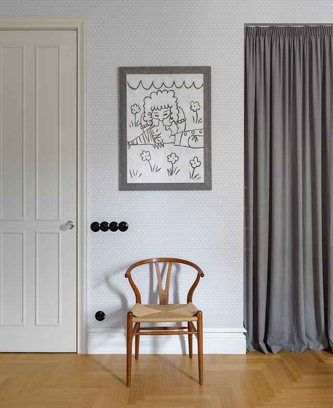 Спальня хозяев. Над стулом дизайна Ханса Вегнера — графика Руслана Вашкевича. Вход в гардеробную закрыт занавесом.