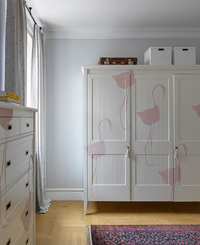 Cпальня хозяев. Мебель прибыла из их прошлой квартиры. Ее стилистика не вписывалась в новый интерьер — Ирина Налимова предложила расписать фасады силуэтами фламинго. Роспись выполнена по трафарету красками с эффектом акварели.