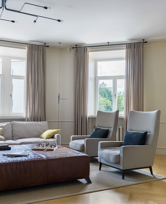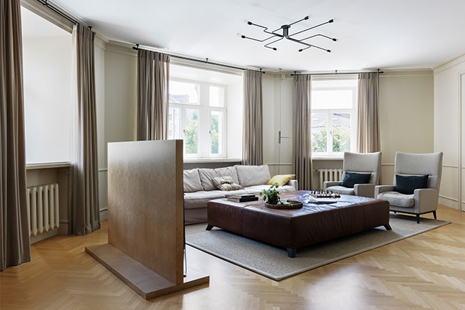 Живут заказчики «на два города». В эстонской столице у них есть дом в престижном квартале, застроенном деревянными виллами. В Минске они приобрели недвижимость в сталинском доме 1952 года: отличную угловую квартиру площадью 185 кв. метров, с эркером и высокими потолками, 3,5 метра. Когда-то она принадлежала местной оперной диве, солистке национального Большого театра. Так что жилье, можно сказать, историческое.