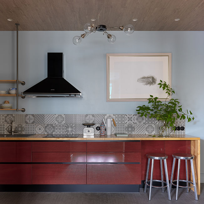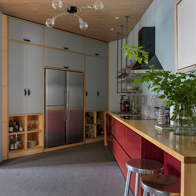 «Спасать» кухню предстояло и с точки зрения цвета. Ирина Налимова придумала, как приглушить излишне активный красный оттенок. Фасады соседних модулей окрасили в оттенок, который дизайнер называет «цветом голубиного крыла». Потолок отделали серым высокотехнологичным ламинатом, имитирующим доску, который обычно применяется для пола, на полу — экологичное покрытие на основе полиуретана. Для кухонного фартука выбрали плитку с монохромным орнаментов. В подобном окружении красный стал выглядеть сдержанно.