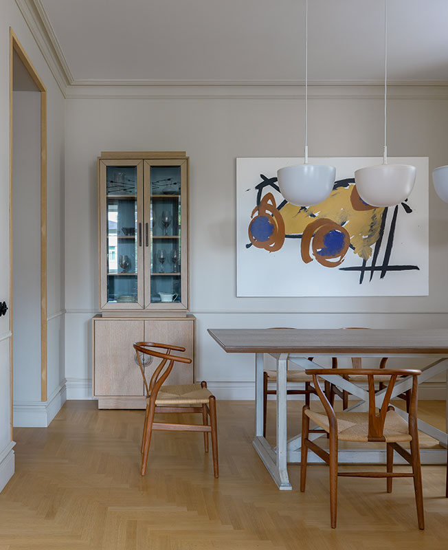 Элегантный шкаф для посуды спроектировала Ирина Налимова. Он вписывается в типологию традиционного буфета, но выглядит современно. Светлое дерево поддерживает скандинавские традиции. На стене работа Руслана Вашкевича.