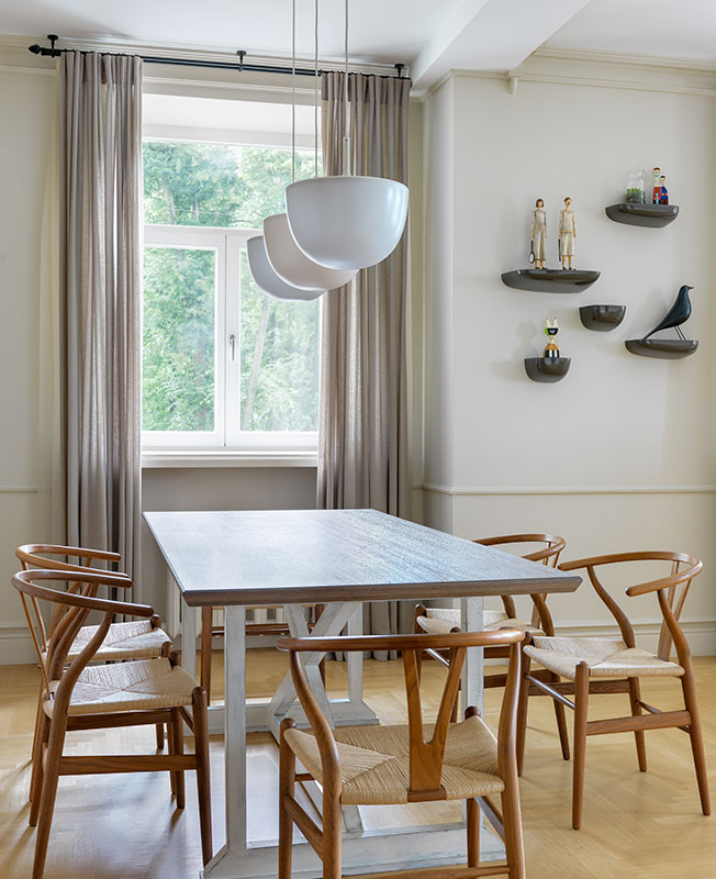 Ольга мечтала о стульях дизайна Ханса Вегнера, модели Wishbone — классика скандинавского дизайна стала украшением столовой. Разумеется, были приобретены «подлинники»: просвященные хозяева знают цену оригинальных вещей, понимают, за что они платят деньги.