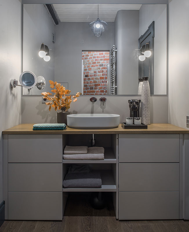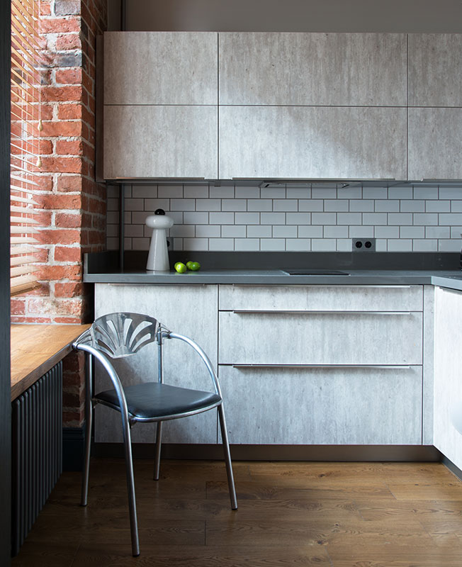 Материалы для квартиры выбирали с ярко выраженной фактурой, чтобы не потерялись на фоне кирпичной кладки. Полы, двери и подоконники выполнены из дерева с ярко выраженным рисунком. Фасады кухни демонстрируют фактуру бетона.