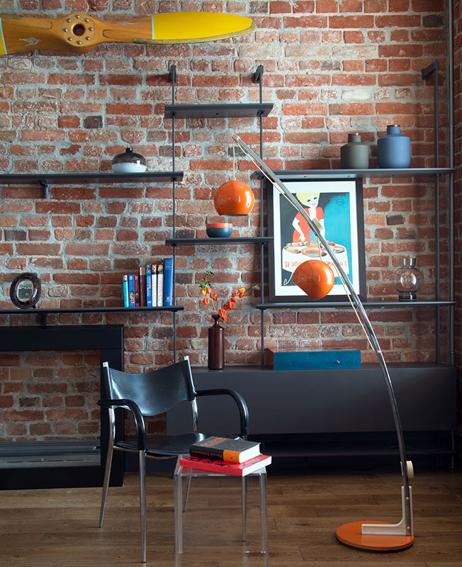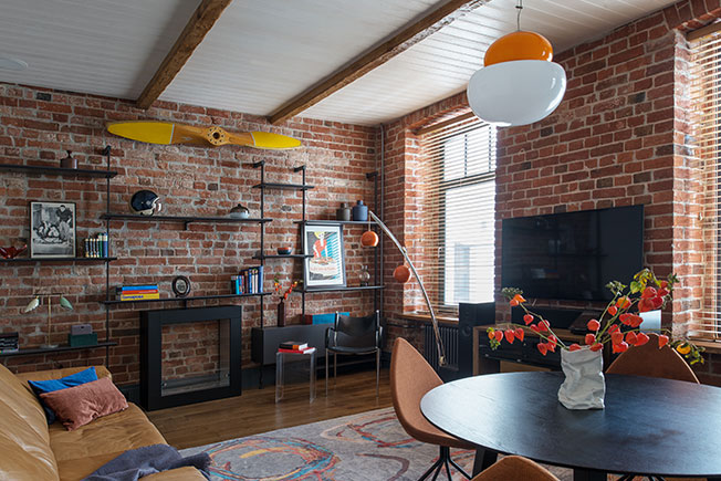 Антикварный кирпич — и конструктивный материал, и декоративный. Он стал очень заметным компонентом интерьера, поэтому было принято решение придерживаться стиля лофт. К счастью, лофтовая стилистика представлена в смягченной форме. Стеллаж из металлических трубок, стулья с трубчатыми основаниями, алюминиевое кресло, жалюзи вместо штор задают нужное настроение.
