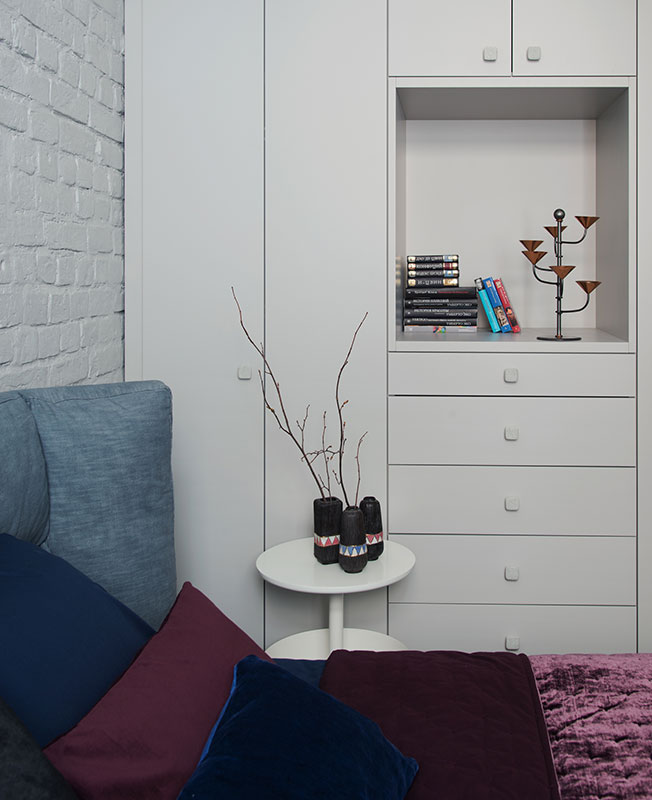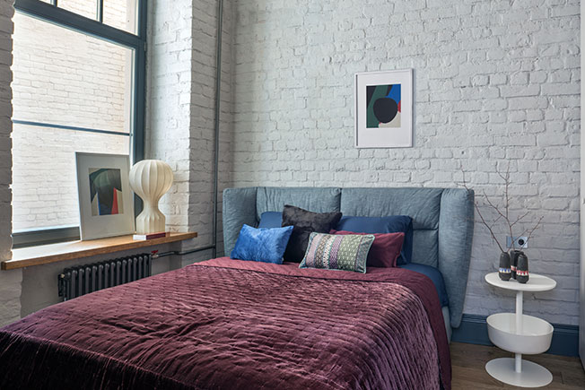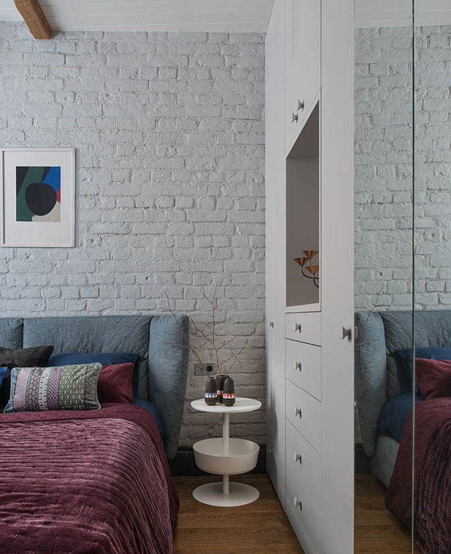 Антикварный кирпич несущих стен удачно сочетали с серо-голубым оттенком на межкомнатных перегородках и темно-серым тоном окон и дверей — контрастные краски подчеркнули и одновременно смягчили активную терракоту кирпича. В спальне кладку покрыли белой краской, справедливо посчитав, что так будет лучше в комнате для сна. Покраска сохранила кирпичную фактуру.