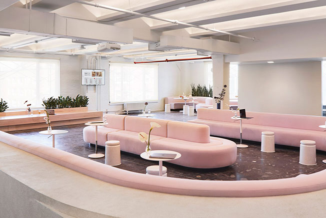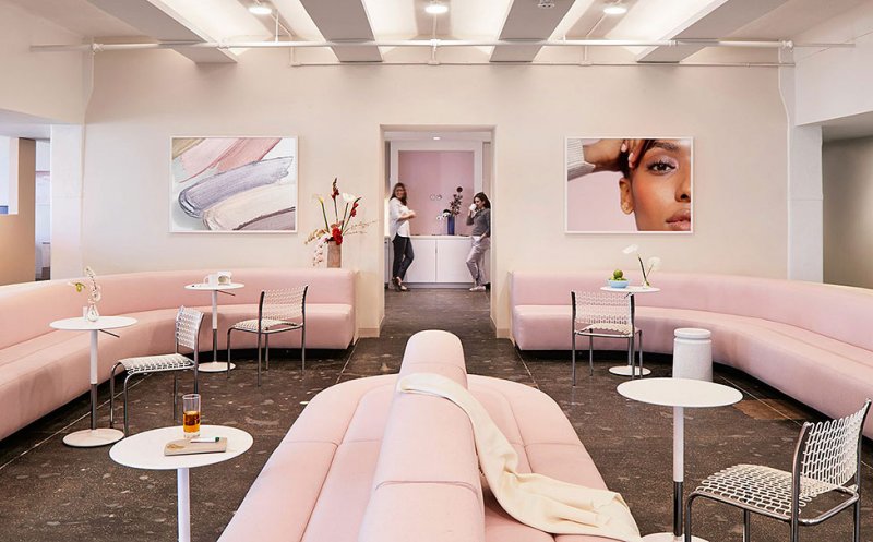 Нью-йоркский архитектор Рафаэль де Карденас его студия Architecture at Large создал офис в бледно-розовых оттенках для бренда Glossier, косметической компании, основанной в 2014 году Эмили Вайс. Бренд пользуется особой популярностью благодаря своей демократичной линейке в розовой упаковке. Деликатные хроматические градации цвета служат как для унификации, так и для изменения общего пространства штаб-квартиры: здесь доминируют бледные, нежные оттенки. В офисе Glossier на Манхэттене спланирована зона регистрации, рабочее пространство открытой планировки, конференц-залы, кухня, ванная комната, а также лаундж с модульной мебелью, который позволяет менять рабочие места. Крупные сиденья и банкетки в форме волны были специально разработаны для проекта. Рафаэль де Карденас соединил их со стульями Макса Лэмба для Hem и стульями Джанфранко Фраттини для Cassina, мебелью Arper, Thonet, винтажными предметами, комнатными растениями и чугунным садовым инвентарем 1940-х годов. В зоне ресепшн стоит черный торшер Periscopio, стол Stilnovo, модульный диван в обивке Kvadrat Maharam. В зоне отдыха есть акцент в виде потолочной подсветки, словно растворяющей сам потолок. Белые стены и бетонные полы создают нейтральный фон для розовых предметов. Все вместе рождает эклектичную, по-домашнему приятную и современную атмосферу для работы.