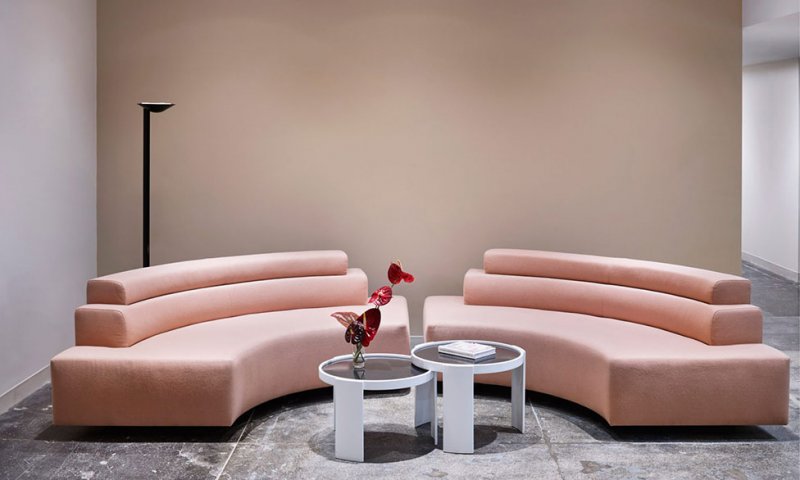В зоне ресепшн стоит черный торшер Periscopio, стол Stilnovo, модульный диван в обивке Kvadrat Maharam. В зоне отдыха есть акцент в виде потолочной подсветки, словно растворяющей сам потолок. Белые стены и бетонные полы создают нейтральный фон для розовых предметов. Все вместе рождает эклектичную, по-домашнему приятную и современную атмосферу для работы.