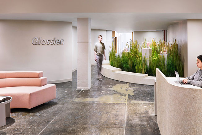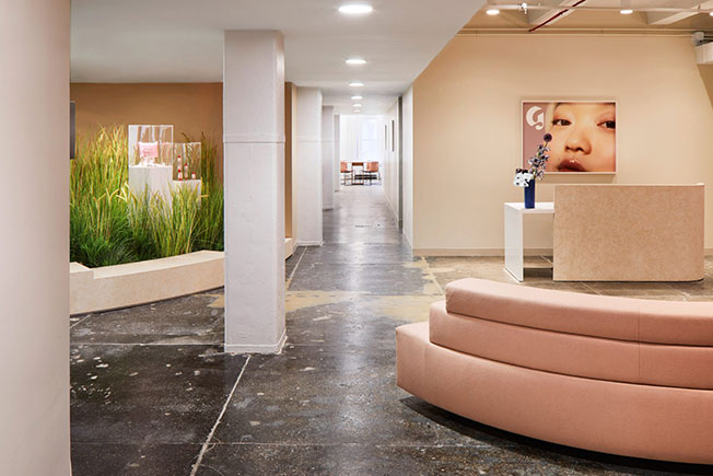 В офисе Glossier на Манхэттене спланирована зона регистрации, рабочее пространство открытой планировки, конференц-залы, кухня, ванная комната, а также лаундж с модульной мебелью, который позволяет менять рабочие места.