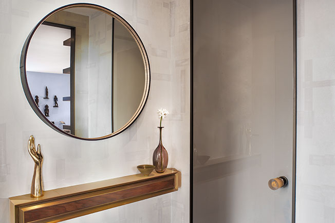Чтобы пространство на сто процентов соответствовало замыслу дизайнера, от старой планировки и отделки полностью избавились. Многие элементы в интерьере, включая настенные покрытия в каждой комнате и мозаику в оттенке белого золота в хозяйской ванной, были созданы на заказ.