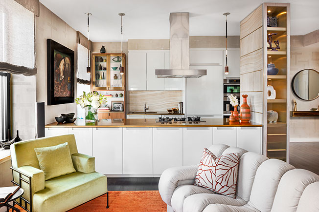 Вид на кухню из зоны гостиной. Диван de Sede. Кресло и кофейный столик, диз. Маттиа Бонетти. Кухонный фартук и отделка стены из оникса. Столешница — патинированная латунь и смола. Вазы End of History.