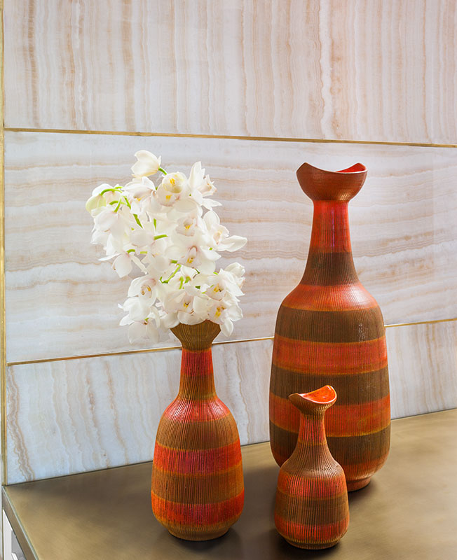 Фрагмент кухни. Отделка стены из оникса. Столешница — патинированная латунь и смола. Вазы End of History.