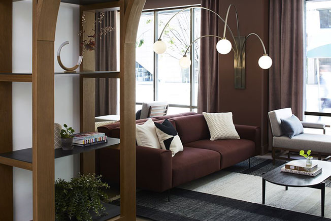 Повсюду в интерьерах — глубокие света, такие как фиолетовый, синий и темно-зеленый. Все они поддерживают ретро-стилистику, в которой картины канадских художников чередуются с изогнутыми креслами, округлыми абажурами ламп и виниловыми проигрывателями.