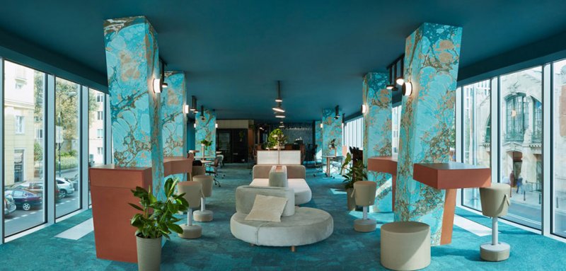 Польская дизайнерская студия Beza Projekt создала рабочее пространство в Варшаве, которое больше похоже на клуб, чем на офис. Интерьеры для компании Nest находятся где-то посередине между рабочим пространством и местом отдыха, создавая современную среду для разных типов деятельности. Граница между трудом и досугом сегодня размыта. С этим нужно смириться и адаптироваться к новым правилам постиндустриальной эпохи. Для того, чтобы привлечь сотрудника к работе вне дома, необходимо предложить комфортную офисную среду. Такую, в которой ему захочется находится не пару часов, а весь уик-энд. Расположенный в здании, спроектированном польскими архитекторами G5 Architekci, офис имеет открытую планировку. Окрашенное от пола до потолка в насыщенный морской оттенок пространство имеет характерные закругления, которые уравновешивают жесткие линии архитектуры здания. Студия выбрала мраморную текстуру, разработанную Kasia Korzeniecka, которая была включена в брендинг и преобразила покрытия для колонн, расставленных по всему интерьеру. Керамическая плитка, обои и ковры также подобраны в богатом оттенке морской волны. Специально для Nest студия разработала две системы мебели. Их элементы можно использовать в различных конфигурациях, чтобы создать многофункциональные острова для повседневной работы, встреч или общения. Стойка регистрации соединена с выставочным залом, на первом этаже есть кафе-бар и большой лаунж с местами для временной работы. На втором этаже спроектирована зона для детей с детской комнатой, где можно оставить своего ребенка с квалифицированной няней на некоторое время. На третьем и пятом и шестом этажах находятся офисные помещения, четвертый этаж и самый верхний этаж посвящен мероприятиям.