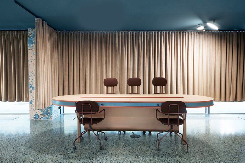 Керамическая плитка, обои и ковры также подобраны в богатом оттенке морской волны. Специально для Nest студия разработала две системы мебели. Их элементы можно использовать в различных конфигурациях, чтобы создать многофункциональные острова для повседневной работы, встреч или общения.